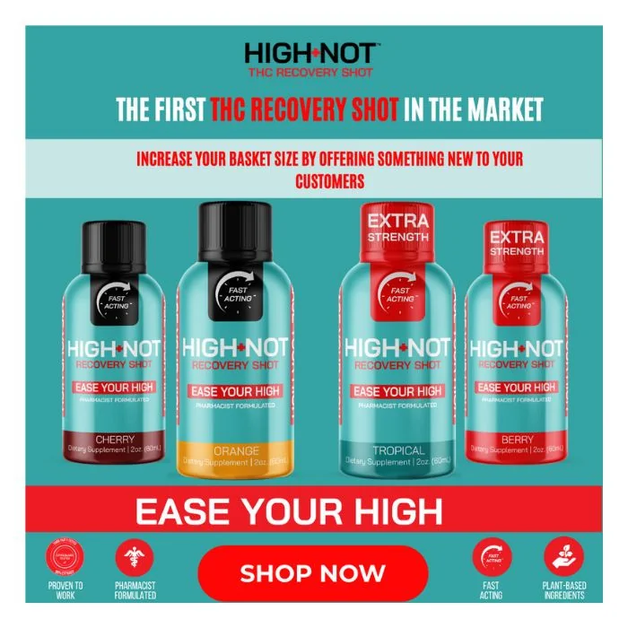 Optimize your cannabis experience with High-Not Recovery Shot, the ultimate solution for counteracting intense effects. Each 60mL shot features a unique, pharmacist-formulated blend of natural ingredients, ensuring rapid, calming, and effective recovery from overwhelming cannabis experiences. Perfect for vape shops and wholesale customers, High-Not Recovery Shot helps users regain control and confidence, allowing them to effortlessly ‘Ease Your High.’ Key Ingredients: Citicoline: Enhances cognitive function and mental clarity for peak brain performance. Piperine (Black Pepper Extract): Acts as a natural modulator, reducing intensity for a balanced experience. L-Theanine: Promotes relaxation and mental focus with its calming properties. Limonene: Contributes to mood enhancement with its citrus-scented terpene profile. Tyrosine: Supports cognitive function and balances effects. α-Pinene: Boosts alertness and maintains a clear-headed state. Who Needs High-Not: New Users: Provides a safety net for those unsure of their reactions. Experienced Users: Mitigates intense effects from overconsumption or new strains. Quick Sober-Up: Ideal for reducing effects swiftly. Medical Users: Offers therapeutic benefits without overwhelming psychoactivity. Controlled Experience: Ensures a more predictable experience. Flavor Options: Orange: Refreshing citrus burst. Cherry: Sweet and tangy cherry delight. Tropical: Exotic fruit medley for a vibrant taste. Berry: Rich and juicy berry blend. Upgrade your inventory with High-Not Recovery Shot, a must-have for customers seeking effective and flavorful solutions to manage their experience. Stock up today and provide a premium recovery option that enhances user satisfaction and loyalty.