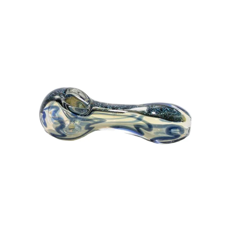 MSRP $14.99 5" size for a comfortable grip Dark, metallic-speckled bowl Iridescent blue swirl fumed glass body Durable, heat-resistant construction Classic spoon pipe design with a roomy bowl Sold as 1 Count COLOR MAY VARY