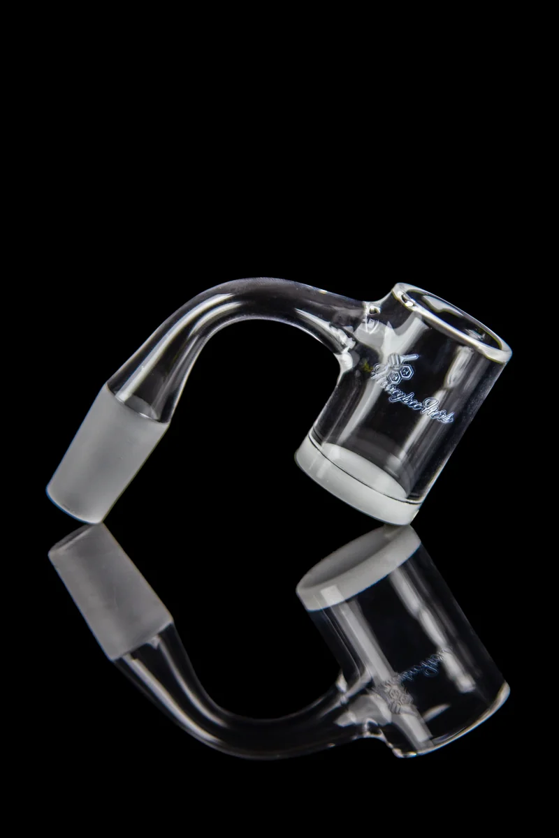 Level up your dabbing experience with this quartz banger by Honeybee Herb. A part of their impressive Honey and Milk series, this banger has a 38mm deep bucket and a seamless welded joint for superior heat retention. The flat-top design features a bevel edge, engineered for an airtight seal with a carb cap. The base is colored in opaque white and is 4mm thick. The rest of the piece is 2.5mm thick and everything is built with top-quality quartz. Engineered for maximum efficiency and flavor, this banger has a 90 degree joint in multiple sizes. Outer Diameter - 25mm