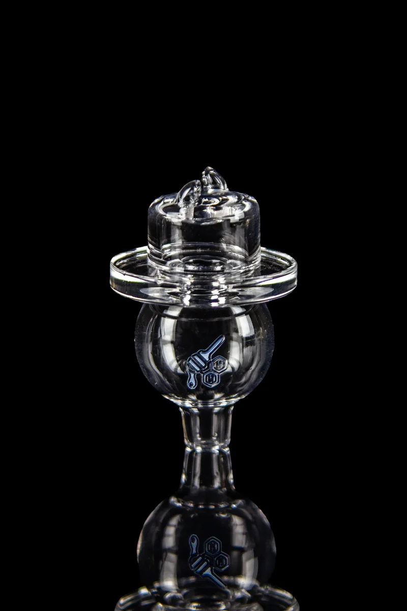 Get those terps spinning so you'll get more enjoyment from your dabs with the Dual Spinner Carb Cap by Honeybee Herb. This beautifully designed cap works best with terp beads that will spin around inside your banger for less wastage and more vapor production. This carb cap is made of high-quality quartz and it's adorned with the classic Honeybee Herb logo to remind you of its high quality. The cap is a tiny piece of functional art that will add a touch of class to any dab rig. The cap will fit on top of most flat-top quartz bangers. Outer Diameter - 30mm Spout Diameter - 8mm Spout Diameter When Flipped - 18mm