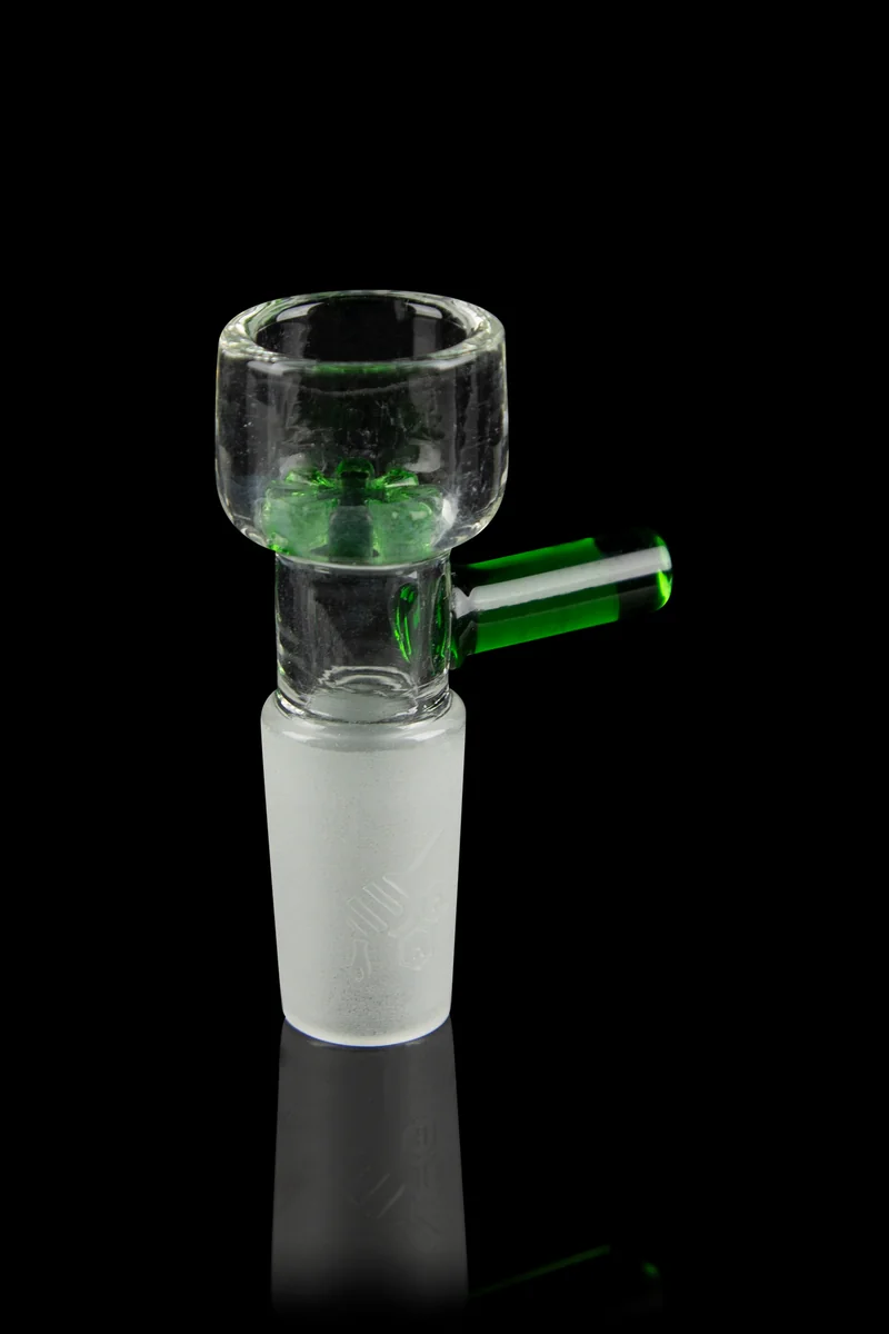 The Honeybee Herb Screened Flower Bowl is a great piece for any smoker who doesn’t like changing dirty bowl screens. This bowl is made of quality, durable glass and it has a built-in glass flower screen . The bowl is outfitted with a frosted 14.5mm male joint, making it compatible with 14.5mm female-jointed bongs. There’s a handle on the side for easy lifting and to protect your fingers from the heat. The handle and built-in screen are colored for some added style in your choice of blue or green. Whether you’re looking for a spare bowl or a new piece to enhance your favorite water pipe, this beauty with the built-in screen is sure to become your new go-to bowl!