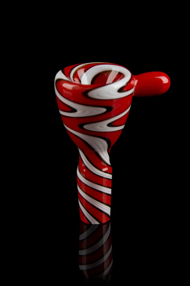 This Wig Wag Funnel Bowl by Honeybee Herb is one sweet looking piece with its colorful wig wag design swirling around the entire piece. It’s made of thick, high-quality glass and features a 14.5mm male joint. If you have a 14.5mm female-jointed water pipe that could use a kick of color, this bowl will do the trick! The bowl is outfitted with a handle to give you a good grip and to prevent it from rolling away when placed on a table. The Wig Wag Funnel bowl is available in blue & red and red & white.