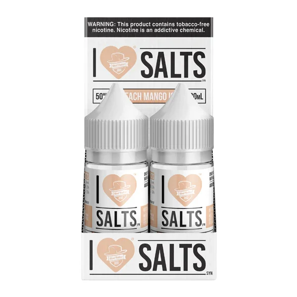 NICOTINE SALTS | PACK OF 6 Flavor : The Peach Mango Ice I Love Salts salt nic vape juice takes a smooth mango base and adds a splash of ripe peach and cool mint flavors to provide a well-rounded vape experience. E-liquid contents : 30mL Nicotine Strengths : 25mg and 50mg Blended for use with Pod Systems Browse more E-Liquid Brands Here