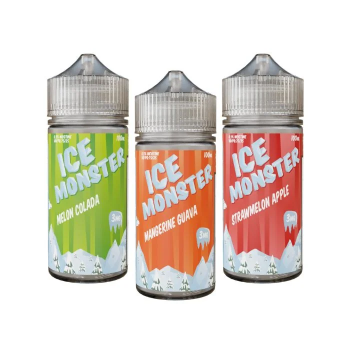 Discover Ice Monster E-Liquids by Monster Group, delivering a superior vaping sensation. Each 100ml bottle offers a choice of nicotine strengths: 0MG, 3MG, and 6MG, catering to every preference. Explore our selection of tantalizing flavors designed to delight: Mangerine Guava: A fusion of tangy mandarin oranges and tropical guava. Melon Colada: A refreshing blend of ripe melons and creamy coconut. Strawmelon Apple: A harmonious mix of juicy strawberries, watermelon, and crisp apple. Choose Ice Monster E-Liquids for an unparalleled vaping experience, curated to satisfy vape enthusiasts.