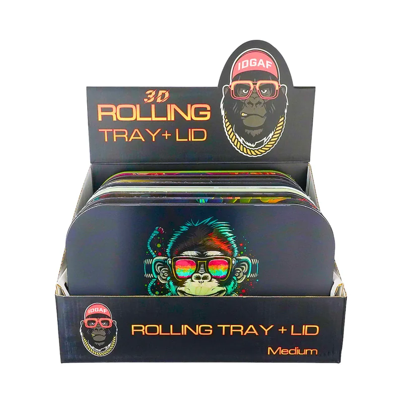 IDGAF 3D MEDIUM ROLLING TRAYS WITH LID ASSORTED DESIGNS DISPLAY OF 8 Add bold design and practicality to your accessory lineup with the IDGAF 3D Medium Rolling Trays with Lid – Assorted Designs, Display of 8 . These premium trays are crafted from durable, lightweight metal and feature a matching fitted lid , allowing users to cover their rolling surface, store materials securely, and prevent spills. The medium size provides extra rolling space compared to the small trays, making it ideal for hom