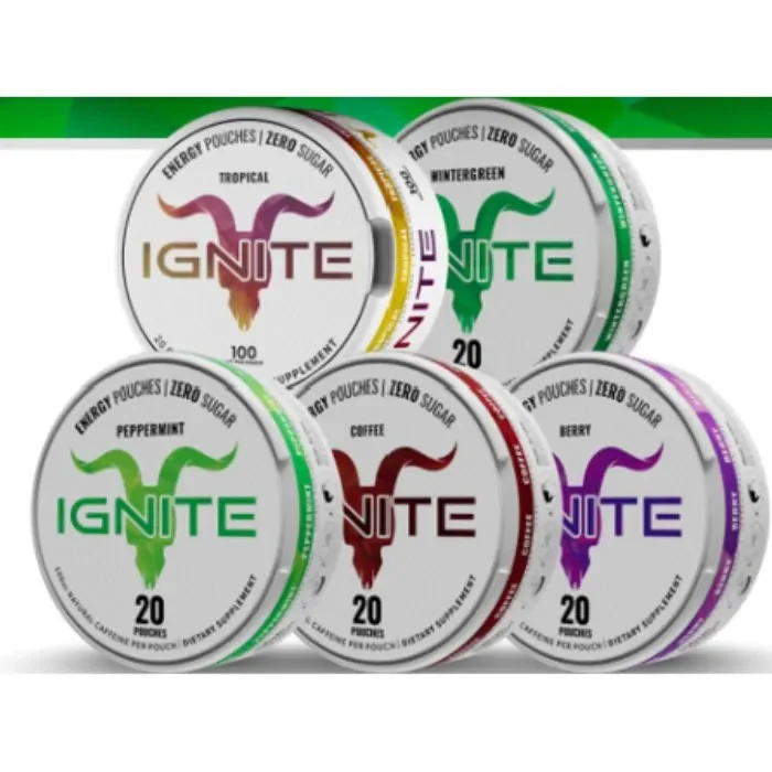 Discover a clean, flavor loaded way to power your day with Ignite Energy Pouches. Designed for active lifestyles, these nicotine-free pouches deliver a bold energy boost providing 100mg of naturally sourced caffeine per pouch—with zero sugar and zero calories. Each pack includes 5 cans with every can containing 20 premium silky pouches for a total of 2,000mg of caffeine per can. Stay energized anytime, anywhere while living your life, your way.Flavors: Berry – Sweet mixed berries with a refreshing finish. Coffee – Rich, smooth coffee flavor for a classic energy kick. Peppermint – Cool, crisp mint with a clean burst of freshness. Tropical – A bright blend of exotic tropical fruits. Wintergreen – Bold, icy wintergreen with lasting coolness. Product Highlights: Nicotine-free & smoke-free. 100mg natural caffeine per pouch. 20 pouches per can | 5 cans per pack. Zero sugar, discreet, and easy to use.