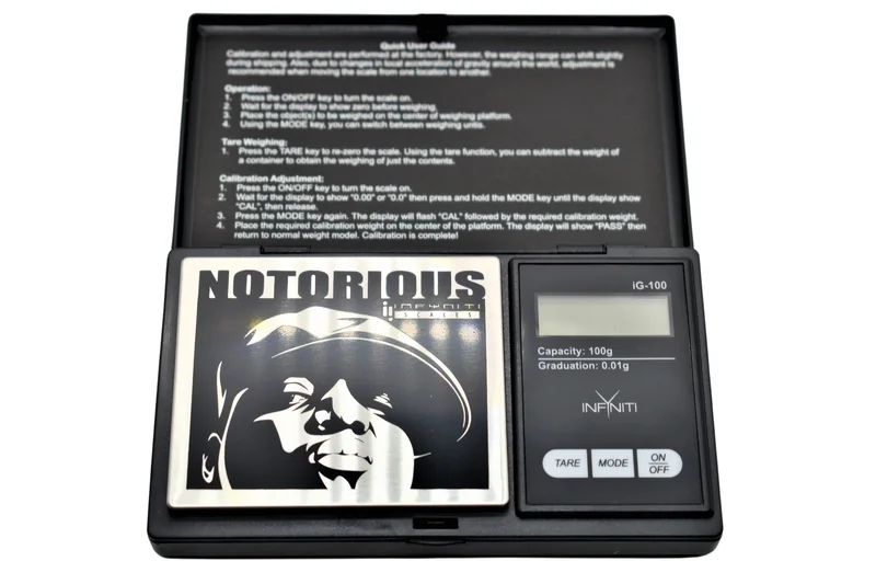 MSRP $19.99 Notorious BIG G-Force, Licensed Digital Pocket Scale, 100g x 0.01g The Infyniti Notorious BIG G-Force Scale maintains the high quality of the Infyniti brand with that extra bit of style. Feel like a G with these high quality digital pocket scales. Scale Features: Capacity: 100g Accuracy: 0.01g Digital display with blue backlight Auto shut off after 60 seconds no activity Large stainless steel weighing platform Standard weight auto calibration 2 x AAA batteries included