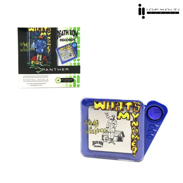 MSRP $17.99 Death Row Records Panther- What's My Name, Licensed Digital Pocket Scale, 50G x 0.01G The Infyniti Death Row Record Panther Scale maintains the high quality of the Infyniti brand with that extra bit of style. Feel like a G with these high quality digital pocket scales. Scale Features: Capacity: 50g Accuracy: 0.01g Digital display with blue backlight Auto shut off after 60 seconds no activity Large stainless steel weighing platform Standard weight auto calibration 2 x AAA batteries included