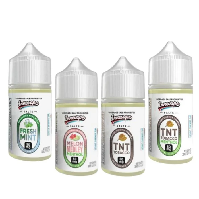 Known for their commitment to quality and innovation, Innevape crafts nicotine salts with bold flavors and smooth experiences. Each blend is meticulously formulated to deliver consistent taste, dense clouds, and satisfaction with every vape. From the iconic blue slushie of Heisenberg to refreshing fruit medleys, Innevape offers a diverse range of nicotine salt flavors to suit any palate. Perfect for both new and experienced vapers, Innevape Nicotine Salts ensure a premium vaping experience with every bottle. Flavor List: BLGN Waffles: A warm, fluffy waffle drenched in syrup with a hint of butter, delivering a classic breakfast delight. COTN Clouds: Fluffy, sweet clouds of cotton candy, capturing the nostalgic taste of a day at the fair. Fresh Mint: A crisp, refreshing burst of mint that leaves your palate feeling cool and invigorated. Heisenberg Berry Menthol: A complex blend of mixed berries with a menthol kick, offering a fruity and cool vaping experience. Heisenberg Berry: A sweet and tart blend of ripe berries, delivering a flavorful and fruity vape. Heisenberg Lemon Sour Menthol: A tangy lemon sour with a menthol finish, offering a zesty and cool sensation. Heisenberg Lemon Sour: A sharp and tangy lemon flavor with a touch of sweetness, perfect for those who love citrus. Heisenberg Menthol: The original Heisenberg blend with an added menthol twist, offering a cool and refreshing vape. Heisenberg: The iconic blue raspberry slushie flavor that has become a staple for many vapers. Melon Medley Menthol: A refreshing blend of melons with a hint of menthol for a cool, fruity vape. Melon Medley: A sweet and juicy mix of melons, offering a smooth and refreshing vaping experience. Mocha Latte: A rich and creamy blend of coffee and chocolate, perfect for coffee lovers. Strawberry Harvest: A sweet and juicy strawberry flavor that captures the essence of freshly picked berries. TNT Tobacco Menthol: A bold tobacco flavor with a crisp menthol kick