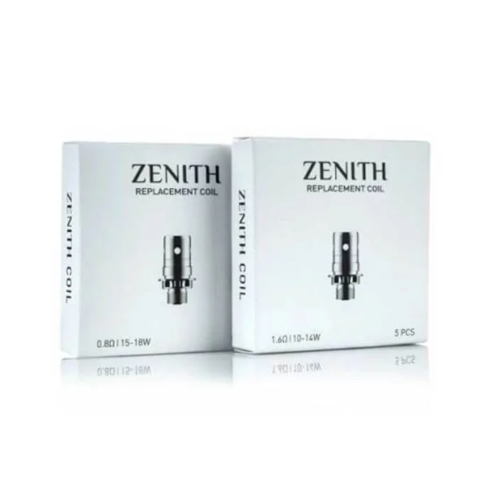 Zenith RDL: Atomizer Resistance: 0.3ohm. Wattage Output Range: 30W - 40W. Zenith Kal: Atomizer Resistance: 0.8ohm. Wattage Output Range: 14W - 17W. Zenith: Atomizer Resistance: 0.6ohm. Wattage Output Range: 9W - 13W. Includes: 5 x Replacement Coil.