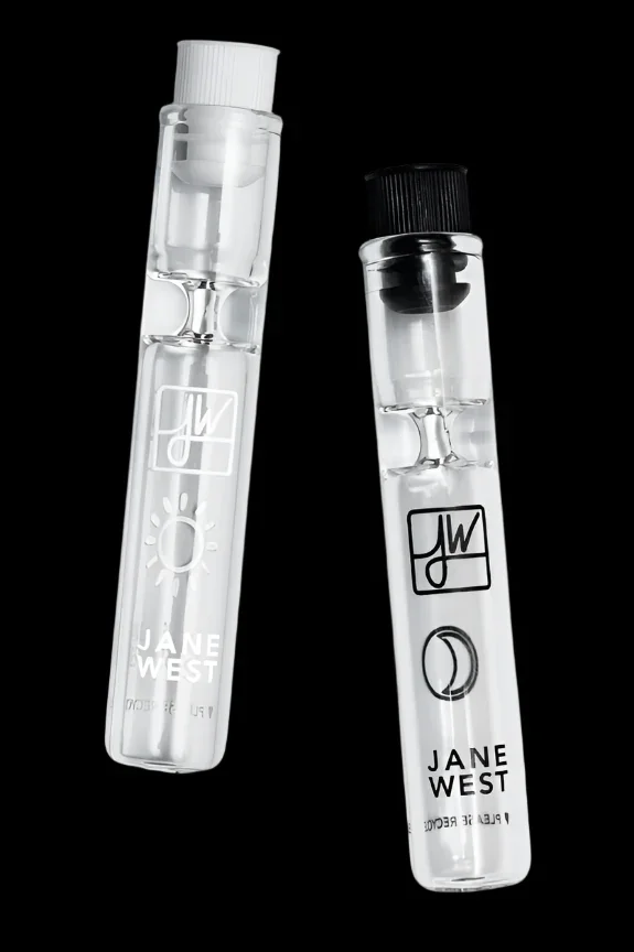 Puff, Puff... Cap! Introducing the ultimate duo for flower enthusiasts: the Jane West Day & Night Travel Pipe Set. Featuring both the Day and Night Travel Pipes, this set offers versatility and convenience. Designed to be your perfect companion, these one-hitters come with resealable caps, allowing you to take your flower with you wherever you go. The white cap for daytime varietals and the black cap for nighttime varietals make it easy to find exactly what you need, when you need it. Whether you’re out for a daytime adventure or winding down for the night, the Jane West Day & Night Travel Pipe Set has you covered.
