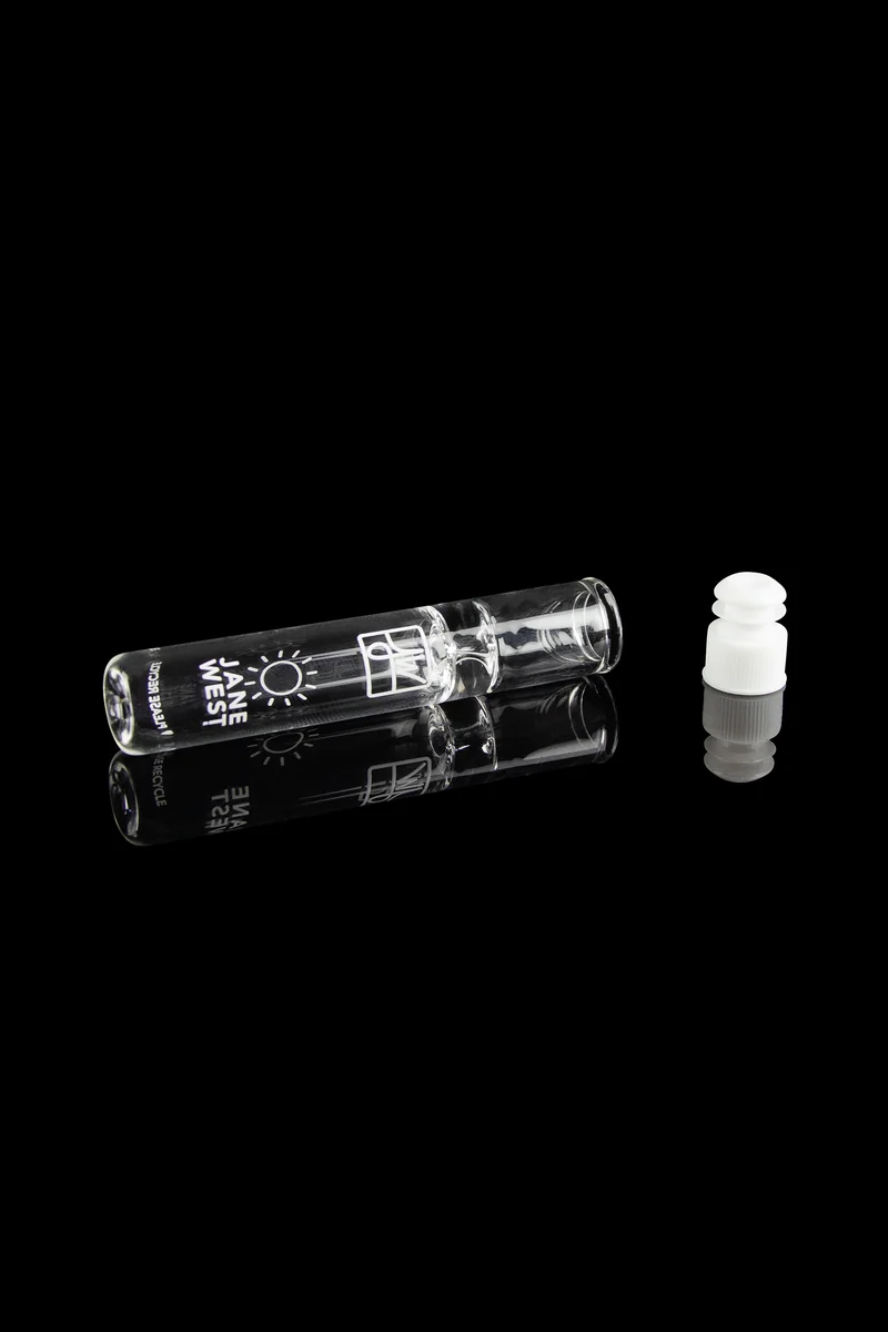 Chillums are always an awesome pick for travel, but this one by Jane West leveled up the game. The piece is an answer to a popular customer demand - a chillum which can be loaded beforehand. It delivered just that - you can pre-pack your herb in the chillum bowl, and seal it with the included cap. The cap prevents spilling, so you can carry your piece with you and fire it up whenever you want. The mouthpiece acts as carb. This chillum measures 3.5" long with the cap attached. The chillum is 15mm in diameter and offers a capacity of 0.35 grams. It's made in the USA using clear 2mm thick borosilicate glass. The small detail on one end is inspired by the sky, and you can choose between a day and night option.