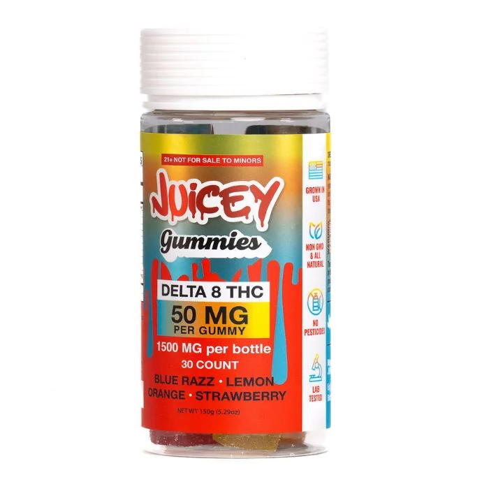 Juicey Gummies Delta 8 THC are a delicious and effective way to enjoy Delta 8 THC. Each gummy contains 50mg of premium Delta 8 THC, offering smooth, uplifting effects. With 30 gummies per bottle, your customers will get a total of 1500mg of THC, crafted with natural, vegan-friendly ingredients. These gummies come in a variety of tasty flavors, perfect for those seeking a flavorful and relaxing experience. Juicey Gummies Delta 8 THC Features Potent Dosing: Each gummy contains 50mg of premium Delta 8 THC, offering a smooth and uplifting experience. Generous Quantity: A bottle includes 30 gummies, providing a total of 1500mg of Delta 8 THC. Flavorful Variety: Enjoy a mix of mouthwatering flavors designed to satisfy your taste buds with every bite. Natural Ingredients: Made with all-natural, non-GMO, and vegan-friendly components for a clean and worry-free experience. High-Quality Craftsmanship: Crafted with superior hemp-derived Delta 8 THC oil for purity and potency. Convenient Relaxation: Perfect for unwinding, enhancing your day, or enjoying moments of tranquility. Juicey Gummies Delta 8 THC Flavors Multi Flavor: Blue Razz, Lemon, Orange & Strawberry: A vibrant mix of fruity flavors that delivers a balanced Delta 8 experience with 1500MG per pack, perfect for those seeking variety and potency.