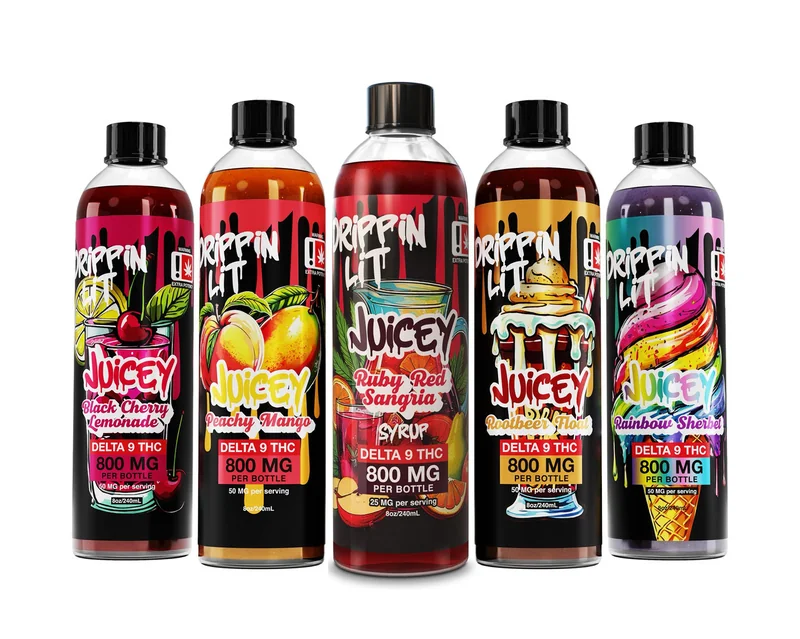 Juicey Delta 9 THC Syrup 800MG is a powerful, natural syrup crafted with hemp-derived Delta 9 THC. Offering 32 servings of 25mg each, it’s perfect for users who want a more intense, fast-acting effect. Enjoy a variety of delicious flavors like Blueberry Cheesecake and Pink Lemonade, and discover a new way to experience THC with rapid absorption. Flavors available: Black Cherry Lemonade – Bold black cherry flavor with a zesty lemonade twist, creating a rich, tangy delight. Peachy Mango – Juicy peach blended with tropical mango for a sweet, luscious taste with a tropical flair. Rainbow Sherbet – A fruity, colorful blend with creamy notes, capturing the classic taste of rainbow sherbet. Root Beer Float – Creamy vanilla with a rich root beer base, delivering the nostalgic taste of a root beer float. Ruby Red Sangria - It’s rich, citrusy, slightly tart, and wildly smooth — just like your favorite glass of sangria.