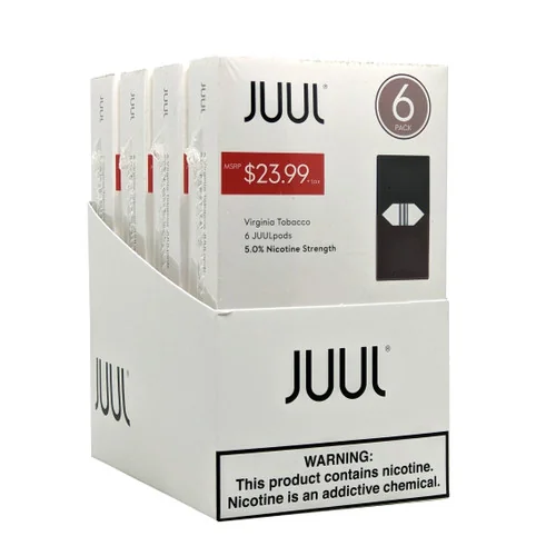 The JUUL Pods 5% 6-Pack | Pre-Priced | Display of 4 delivers a smooth, flavorful vaping experience in a convenient disposable format. Comes in a quantity of display of 4. Suggested retail price $23.99. A top-moving item for smoke shops and convenience stores. Available at wholesale pricing from Port City Wholesale.