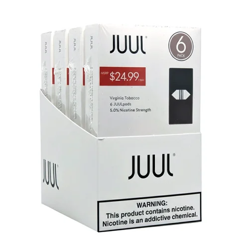 The JUUL Pods 5% 6-Pack | Pre-Priced | Display of 4 delivers a smooth, flavorful vaping experience in a convenient disposable format. Comes in a quantity of display of 4. Suggested retail price $24.99. A top-moving item for smoke shops and convenience stores. Available at wholesale pricing from Port City Wholesale.