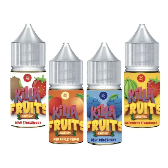 Elevate your vaping experience with Killa Fruits Nicotine Salts, available in 30mg and 50mg strengths. Each 30ml bottle delivers a smooth and satisfying throat hit with bold fruit flavors, perfect for those seeking a richer nicotine experience. Designed for use with low-wattage devices, these nicotine salts offer a refined and flavorful vape, combining high-quality ingredients with vibrant fruit profiles. Ideal for both new and experienced vapers looking for a premium, fruity, and satisfying nicotine salt option. Flavors: Blue Raspberry: A tangy and sweet blue raspberry flavor, providing a burst of vibrant fruitiness with each puff. Kiwi Strawberry: A delightful blend of juicy strawberries and tart kiwis, creating a perfectly balanced and fruity experience. Raspberry Black Cherry Lemon: A complex mix of ripe raspberries, dark cherries, and zesty lemon, delivering a refreshing and layered flavor profile. Red Apple Peach: Crisp red apples paired with juicy peaches, offering a sweet and succulent fruit blend that's both satisfying and refreshing. Strawberry Acai: Sweet strawberries combined with exotic acai berries, providing a rich and fruity vape with a touch of tropical flair. Watermelon Nectarine: A juicy mix of ripe watermelon and tangy nectarines, delivering a refreshing and sweet fruit flavor. Watermelon Strawberry: A luscious blend of juicy watermelon and sweet strawberries, creating a perfectly balanced and refreshing fruity vape.