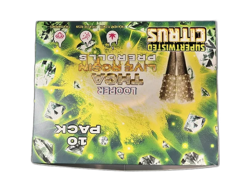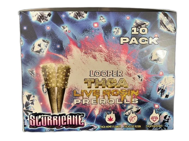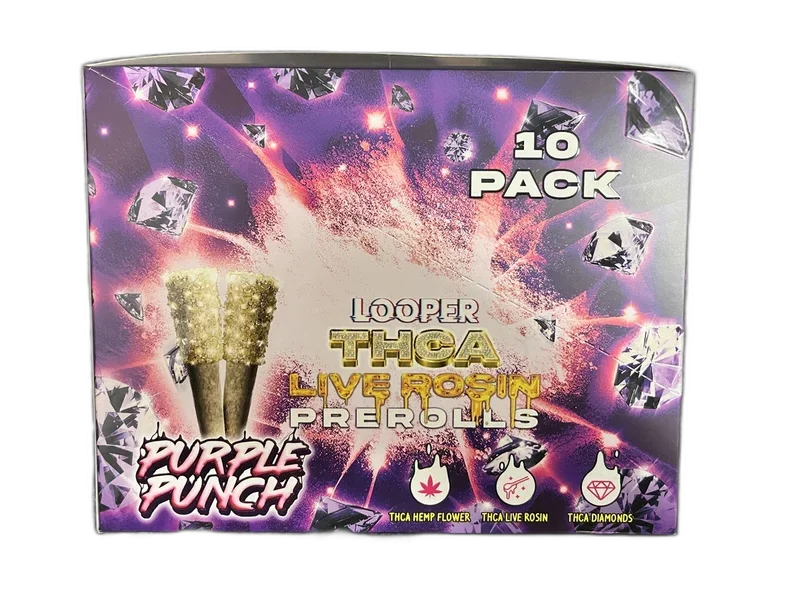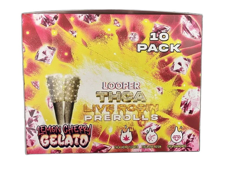 Looper 1g THCa Pre-Roll 2-Pack Display packs 10 individually sealed 2-packs into a retail-ready countertop display. Each pre-roll combines premium THCA Hemp Flower with THCA Live Rosin and THCA Diamonds for a triple-infused experience. Available in Candy Land, Lemon Cherry Gelato, Purple Punch, Slurricane, Super Runtz, and Super Twisted Citrus. This is Looper's flagship pre-roll — engineered for maximum potency and flavor. Fully compliant with the 2018 Farm Bill — contains less than 0.3% Delta-9 THC. Third-party lab tested for potency, pesticides, and heavy metals.