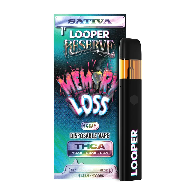 Strain Type: Sativa Cannabinoid Blend: THC-A + THC-P + HHC-P + HHC Dominant Terpenes: Terpinolene, Eucalyptol, Camphene, Caryophyllene Parent Strains: Amnesia Haze, Face Off OG Volume: 1g Get ready for a mind-bending rush with the Looper Reserve Memory Loss Disposable, a fast-acting sativa designed for those who crave an intense cerebral buzz. Powered by a dynamic blend of THC-A, THC-P, HHC-P, and HHC, this strain delivers a euphoric, heady high that sharpens focus while sending creativity into overdrive. Expect a sharp citrus-pine aroma with hints of herbal spice and cooling eucalyptus, creating an invigorating and crisp flavor profile. Ideal for daytime use, this 1G disposable is perfect for powering through projects, sparking new ideas, or simply losing yourself in the moment.