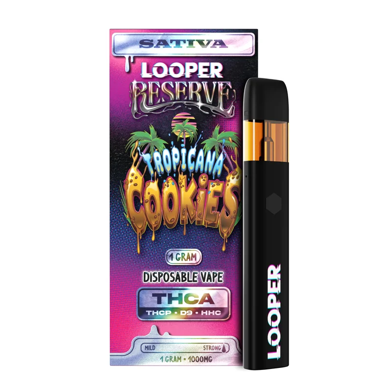 Strain Type: Sativa Cannabinoid Blend: THC-A + THC-P + D9 + HHC Dominant Terpenes: Valencene, Terpinolene, Caryophyllene, Limonene Parent Strains: Girl Scout Cookies, Tangie Volume: 1g Energize your senses with Looper Reserve Tropicana Cookies Disposable, a vibrant sativa bursting with citrus and sweet tropical flavors. Powered by a potent blend of THC-A, THC-P, D9, and HHC, this strain delivers an uplifting, euphoric high that sharpens focus and boosts creativity. Zesty orange and tangerine notes dominate each inhale, followed by a smooth earthy cookie finish that lingers. Perfect for daytime adventures or a creative spark, this 1G disposable is your go-to for a refreshing and invigorating experience.