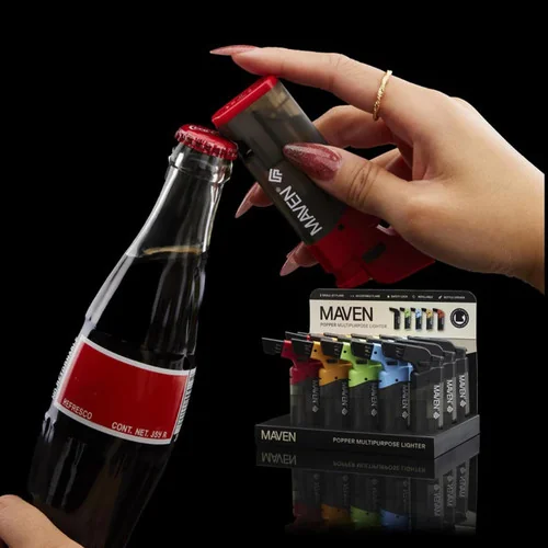 Popper Torch - Neon - Display of 15 by Maven. Well-made, functional, and priced to move. A solid addition to any smoke shop's product lineup. Suggested retail: $15.00.