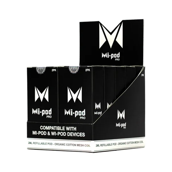 Created with feedback & input from users all over the world, our new Pro Pods offer an enhanced Mi-Pod vaping experience. Each box of Mi-Pod Pro Replacement Pods has a quantity of two, which makes for a total of 20 pods in this case. The Mi-Pod Pro has an integrated coil and holds 2ml of e-liquid. The Mi-Pod Pro is an ideal product for any adult seeking a discrete vape that can handle salt nic, regular e-liquids, and CBD. Repeat customers will want to stock up on these refillable vape pods because even this long-lasting design eventually loses a bit of flavor and vapor production. Compatible with Mi-Pod PRO devices. Redesigned for performance and ease of use. Filling Instructions Remove the Silicone 'Open Tab' Fill with E-Liquid through the side filling port Give the Pod time to wick to prevent dry hits Align pins on the Pod to Connectors inside device Taller Mouthpiece A high-profile design not only provides an easier experience when inserting/removing the Pod, but is farther fitting to avoid hot vapor to the lips. Side-Filling The large side-filling tab opens up possibilities with your Mi-Pod, preventing leaks and designed to fit all sizes of E-Liquid bottles. Balanced Airflow Bridging MTL and DTL vaping, the new carefully balanced airflow provides a crisp and satisfying feel. Paired with an enhanced coil for premium vapor quality. Advanced Mesh Coil Compatible with all E-Liquid types, the redesigned coil amplifies vapor quality with faster wicking using organic cotton. Rated at 0.9 Ohms for a flavor packed subohm experience, hard-hitting with every draw. Balanced Airflow Bridging MTL and DTL vaping, the new carefully balanced airflow provides a crisp and satisfying feel. Paired with an enhanced coil for premium vapor quality. Advanced Mesh Coil Compatible with all E-Liquid types, the redesigned coil amplifies vapor quality with faster wicking using organic cotton. Rated at 0.9 Ohms for a flavor packed subohm experience, hard-hitting with every draw.