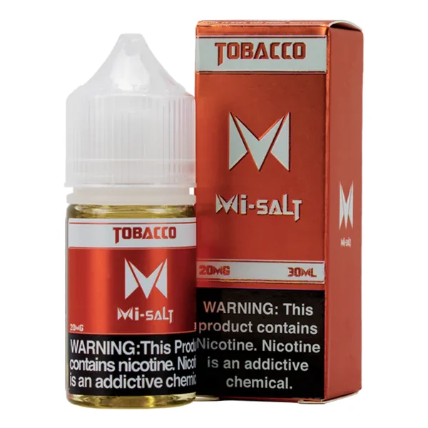 NICOTINE SALTS | PACK OF 6 Flavor : Tobacco Mi-Salts by Mi-One Brands defines a classic red tobacco flavor, bringing together notes of maple sweetness with bold American tobacco taste. Experience a traditional tasting tobacco flavor with your favorite pod system. E-liquid contents : 30mL Nicotine Strengths : 20mg and 40mg Blended for use with Pod Systems Browse more E-Liquid Brands Here