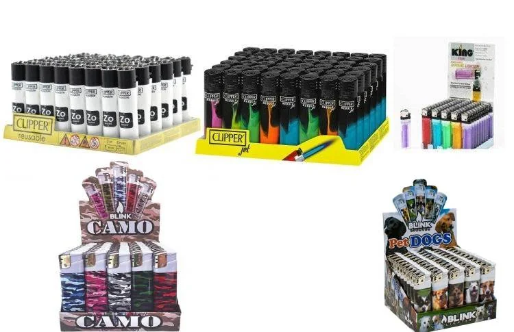 This is a great starter kit of our best selling lighters for shops! This kit includes one of each of the following displays: Clipper Lighter Jet Flame Solid Assorted Colors Lighters Blink Lighter Display - Assorted Bald Eagle Designs - (50 Count Display ) King Classic Disposable Lighter (50 Count) 587 - Blink Lighter Display - Assorted Camo Designs - (50 Count Display) 581 - Blink Lighter Display - Assorted Dog Designs - (50 Count Display) Lighters May Vary