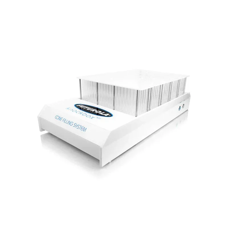 **SHIPS IN 7-10 DAYS** Introducing the Futurola Knockbox500, the ultimate automated filling system designed to revolutionize your rolling experience. This state-of-the-art machine combines precision engineering, efficiency, and convenience, allowing you to effortlessly fill a large quantity of pre-rolled cones in a fraction of the time. The perfect filling and packing machine, you can use the Knockbox after you've efficiently ground up your flower with the Futurola Shredder Machines Compatible with many varieties of Futurola pre-rolled cones, the Knockbox helps you accommodate for different diameters of pre-rolled cones. Compatibility With Futurola Pre-Rolled Cones* Standard and Base: 109/26 | Standard Paper Cones | King 109/26 | Standard Blunt Cones | King 109/21 | Standard Paper Cones | King 98/26 | Standard Paper Cones | Slim 84/26 | Standard Paper Cones | 1 1/4 84/26 | Standard Blunt Cones | 1 1/4 The Knockbox 500 has the Controller and Power Adapter built into the device. The Standard Filling Kit includes: Standard Filling Device 36mm Mix Tray The Futurola Knockbox FIlling Device is also available separately from the Knockbox addition. If you'd like to purchase just the filling kit, you have that option! Looking for something for Fatboy or Party sizes instead? Make sure you check out the Futurola Fatboy + Party Knockbox Filling Devices. It's the ideal addition for quick and larger production! To further optimize efficiency, use the Cone Loader and Unload Station, as well as the Dutch Crown Device to close the tops of filled pre-rolls. With filling cycles of 60 or 90 seconds using the density-button on the Controller, the Futurola KB300 stands out as the ultimate choice for high-capacity, precision pre-roll production.