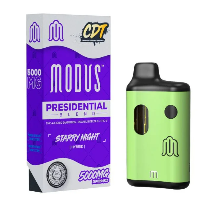 Welcome the Presidential Blend, a luxurious blend of top-tier cannabinoids for the discerning cannabis enthusiast. Crafted with THC-A Liquid Diamonds, Pegasus Delta 8, THC-V, and CDT, this blend offers an unparalleled experience. Modus Presidential Blend Disposable Vape 5G Highlights: Potency: 5000mg Disposables. Key Ingredients: Pegasus Delta 8, THC-A Liquid Diamonds, THC-V, CDT. Convenience: USB-C Charging for Disposables. Quality Assurance: Made with US-Grown Hemp, Third-Party Lab Tested.