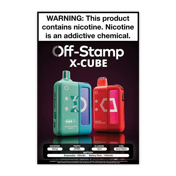 Showcase the Off Stamp X-Cube vape with this striking 12-inch by 18-inch poster , perfect for drawing attention to this high-demand product. Designed to make an impact in your storefront windows or interior displays , this poster highlights the premium quality and style of this popular product. A must-have marketing tool for vape shops, smoke shops, and convenience stores looking to boost visibility and sales for this impressive product line. Key Features: Dimensions: 12" x 18" Promotes the Off Stamp X-Cube Disposable Vape Ideal for store windows and in-store displays Eye-catching design to increase customer interest and sales Limit of 2 posters per order View more Marketing Materials for all brands here