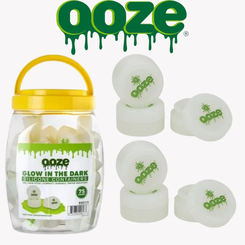 OOZE - SILICONE CONTAINERS GLOW IN THE DARK Ooze Silicone Containers are ideal for storing any and all types of concentrates for dabbing and vaping. Extracts are kept fresh with an airtight seal, and the non-stick material guarantees you won't lose any product. The white silicone glows in the dark, making nighttime seshes easier. This tub contains 75 5mL silicone stash jars. This tub is an incredible wholesale value, and these stash boxes make great add-ons to any dab rig or vape-related s
