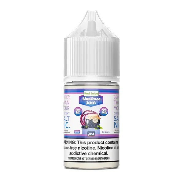 NICOTINE SALTS | INDIVIDUAL BOTTLE Flavor : Blue Razz Jam Pod Juice uses a fruity mix of raspberry and blueberry jam flavors in a salt nic vape juice for pod devices. E-liquid contents : 30mL Nicotine Strengths : 20mg, 35mg and 55mg Blended for use with Pod Systems Browse more E-Liquid Brands Here