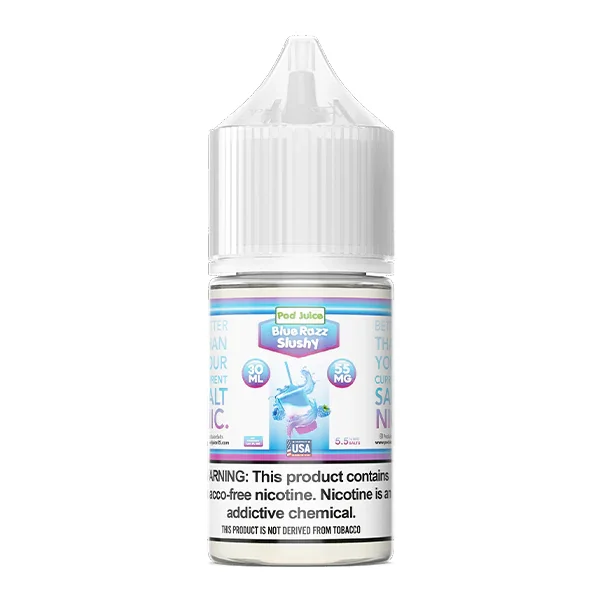 NICOTINE SALTS | INDIVIDUAL BOTTLE Flavor : Blue Razz Slushy Pod Juice uses a super sweet blue razz candied taste. E-liquid contents : 30mL Nicotine Strengths : 20mg, 35mg and 55mg Blended for use with Pod Systems Browse more E-Liquid Brands Here