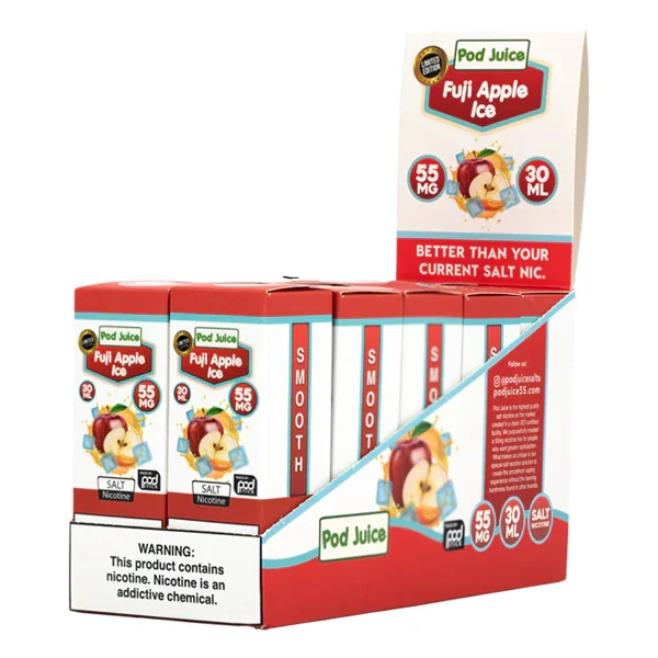 NICOTINE SALTS | PACK OF 10 Flavor : Fuji Apple Ice by Pod Juice is of the most incredulous apple flavors you will ever try. Fuji Apple Ice is just as irresistible as it sounds. A crisp apple with a smooth cool ending is a perfect way to relax at the end of the day. Inhale apple, exhale happiness. E-liquid contents : 30mL Nicotine Strengths : 35mg and 55mg Blended for use with Pod Systems Browse more E-Liquid Brands Here