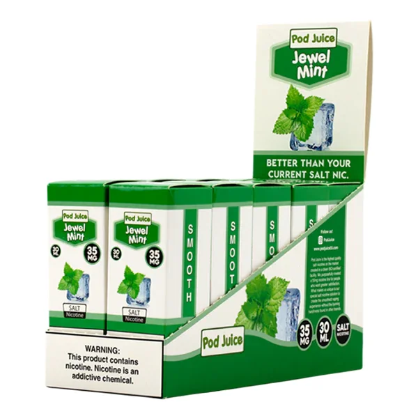 NICOTINE SALTS | PACK OF 10 Flavor : Jewel Mint by Pod Juice is truly a menthol masterpiece. After trying dozens upon dozens of different mint salt nic profiles, pod juice came up with their one and only signature fresh cool mint flavor. The inhale is a super cool frost, while at its exit, the exhale develops into a slightly sweet mint fusion. This flavor is incredibly popular with our menthol smokers and those who simply want that refreshing experience of every mint on earth combined into one puff. E-liquid contents : 30mL Nicotine Strengths : 20mg, 35mg and 55mg Blended for use with Pod Systems Browse more E-Liquid Brands Here