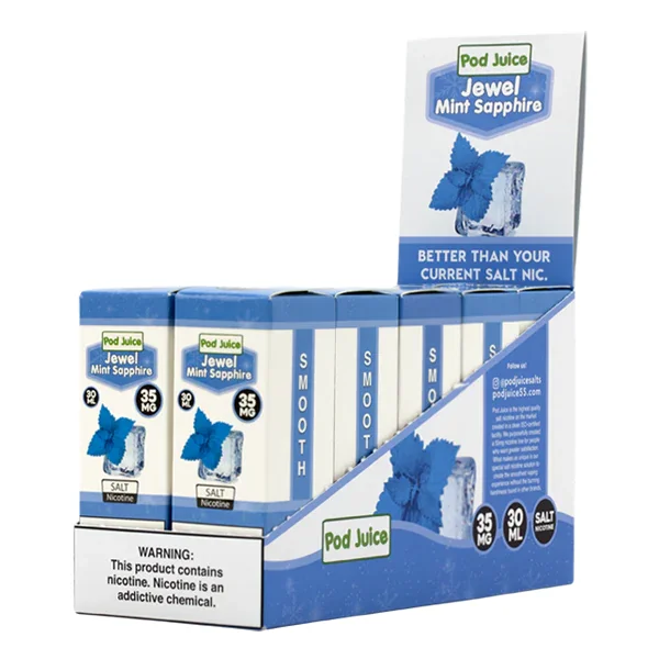 NICOTINE SALTS | PACK OF 10 Flavor : Jewel Mint Sapphire by Pod Juice has the same frosty cool inhale as the original Jewel Mint, combined with an intricately crafted boost in flavor and minty sweetness. E-liquid contents : 30mL Nicotine Strengths : 35mg and 55mg Blended for use with Pod Systems Browse more E-Liquid Brands Here