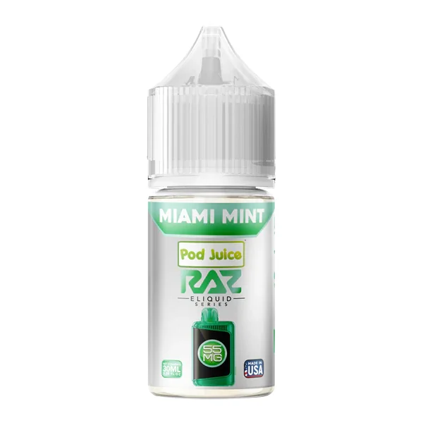 RAZ X POD JUICE NICOTINE SALTS Flavor : Miami Mint RAZ Pod Juice uses a top-selling RAZ flavor that features a sweet, refreshing mint taste. RAZ x Pod Juice flavors are perfect for disposable vape customers looking to switch to refillable pod kits. E-liquid contents : 30mL Nicotine Strengths : 35mg and 55mg Blended for use with Pod Systems Browse more Wholesale E-Liquids