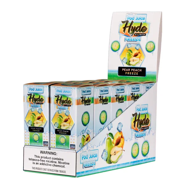 NICOTINE SALTS | PACK OF 10 Flavor : This 10-pack of wholesale price Pear Peach Freeze Pod Juice bottles feature a sweet and sour blend of ripe peach and pear flavors with a strong menthol kick. Buy the Pear Peach Freeze Hyde X Pod Juice at wholesale pricing today. E-liquid contents : 30mL Nicotine Strengths : 35mg and 55mg Blended for use with Pod Systems Browse more E-Liquid Brands Here