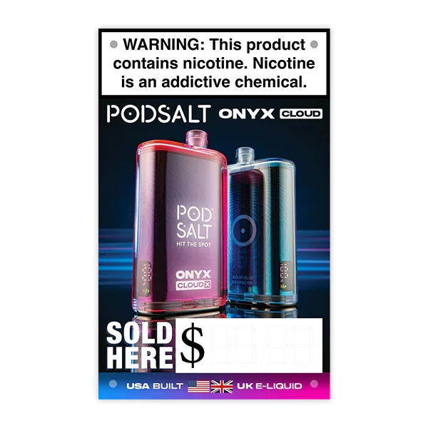 POD SALT ONYX CLOUD X Banner Vinyl Banner - 15"x24" - Durable Indoor & Outdoor Marketing Display Boost your store’s visibility with this high-quality POD SALT ONYX CLOUD X vinyl banner . Measuring 15 inches by 24 inches , this banner is designed for maximum impact in both indoor and outdoor settings . Draw attention to this USA-filled disposable vape with premium, lower nicotine, UK-made e-liquids. Featuring 4 pre-installed grommet holes , it’s easy to hang in multiple locations like windows, walls, or outdoor displays. The durable vinyl material ensures long-lasting use, even in challenging weather conditions. Ideal for vape shops and retail environments . Limit of 2 banners per order . Key Features: Dimensions: 15" x 24" Durable vinyl material for indoor and outdoor use 4 grommet holes for versatile hanging options Weather-resistant design for longevity Perfect for vape stores, retail stores, smoke shops and promotional displays Mi-Pod is your number one source for wholesale vapes , hardware, and alternative products. View more Marketing Materials