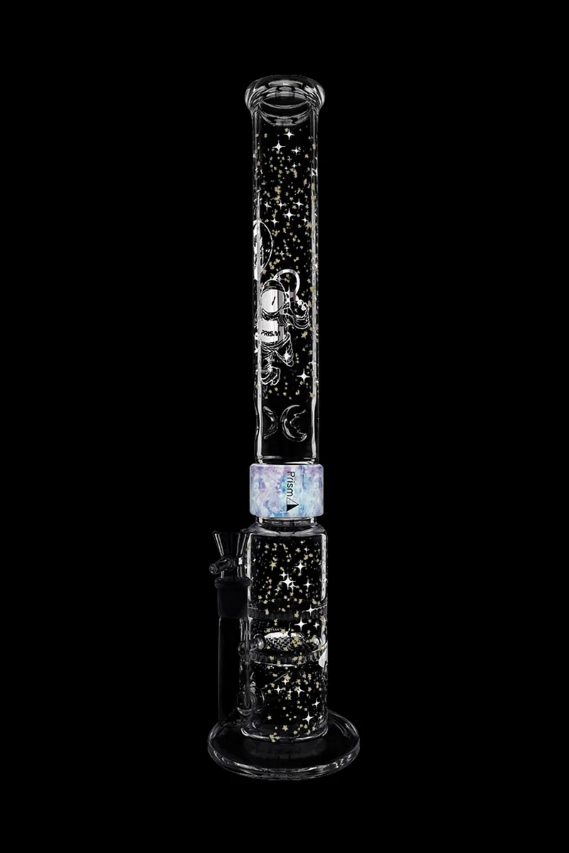 The 19.3-inch tall Halo Spaced Out Big Honeycomb Single Stack is a modular bong by Prism that’s ideal if you’re looking for a high-functioning piece with a large chamber to fill. This big and beefy bong produces milky smooth hits thanks to its two honeycomb percolators and the straight perc fixed downstem. This water pipe comes with a clear Spaced Out tall mouthpiece, a Spaced Out big honeycomb base, a clear 18.8mm male bowl, and a Tie Dye Halo connector. Because it’s a part of Prism’s custom bong system, this gorgeous beast can be broken down for easy cleaning, parts replacement, switching parts, and travel. This impressive bong is made of 5mm thick borosilicate glass and features a 18.8mm female joint. There’s a thick round base on the bottom for stability and a flared mouthpiece on top for comfort during use.
