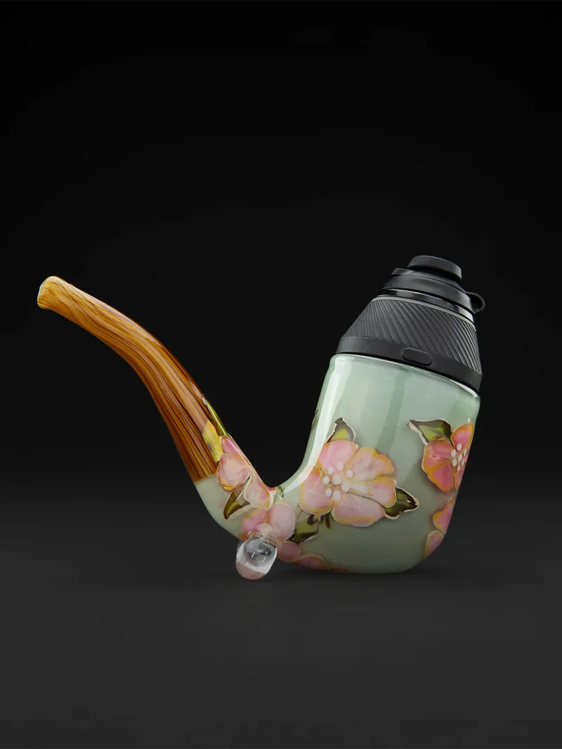 The Proxy Antique Rose piece features Sarita’s signature floral motif on a Ghosted Mint (PDX Tubing) background. The stem is made with a glass woodgrain prep from Shaggy (@glassartbyshaggy). Each bloom is flame-formed and fumed with real gold, which is then encase d with clear. This gives the flowers a pink-gold luster that shimmers in the sunlight. The piece is meant to be elegant and classy; a nod to the opulent decor of the Gilded Age. Device not included. All sales final.