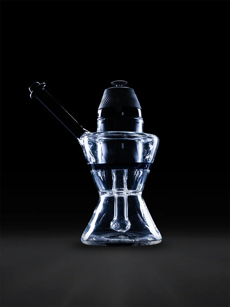 Shaped in transparent glass, Pakoh’s hourglass water pipe for the Proxy is designed to showcase the clouds as they build inside. An etched embellishment at the base adds subtle artistry, while Galaxy Black glass accents the stem, mouthpiece, and a slim band on the reservoir. Device not included. All sales final.