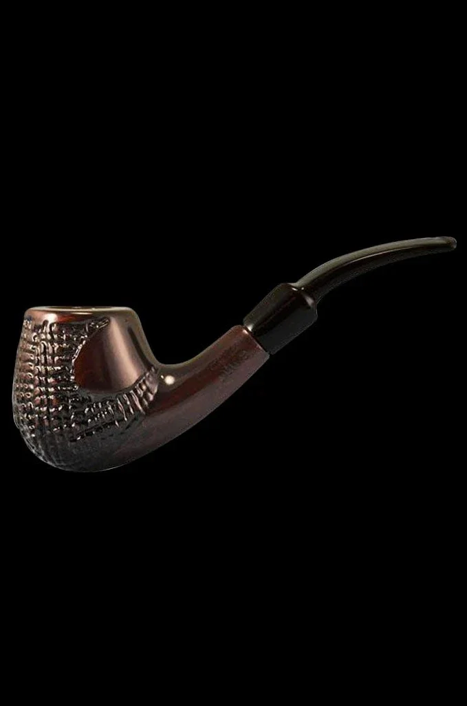 Enjoy a classic smoking experience with this Cherry wood pipe by Pulsar. The Engraved Brandy Cherry Tobacco Pipe is a beautiful piece measuring 5.5 inches long. It features an engraved figured bowl design that looks and feels exquisite and a bent stem for comfortable use. This nice pipe would be a wonderful addition to any collection of high-quality wooden pipes and it's a pleasure to smoke from. The pipe comes with a brushed cotton pouch, a removable charcoal filter, and a plastic pipe stand. Treat yourself to this beautiful hand pipe and enjoy owning one of Shire Pipe's most popular models.