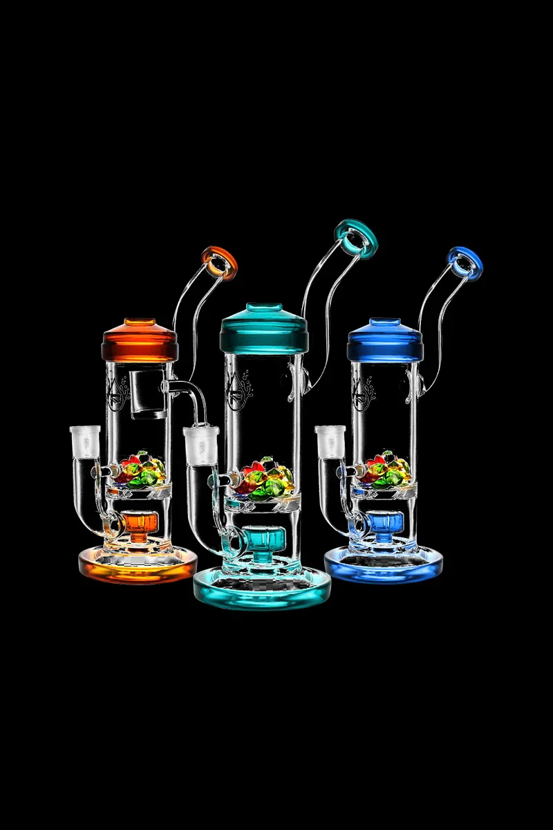 Offering maximum percolation power , the Hidden Gems French Press Rig is designed to deliver silky smooth rips that are full of flavor. Your concentrates will be vaporized the right way with this awesome rig that's made of thick borosilicate glass. This 14.5mm female-jointed rig stands 9.5-inches tall and features a disc percolator that creates lots of bubbles in the main chamber and a vortex perc on top. The main attraction of this colorful and productive rig are the gem-shaped perc beads that work to break up and cool your smoke. When you take your draw from the comfortably angled mouthpiece, you'll be blown away by smoothness and flavor. If you're looking to take your dabs to the next level, your hunt is over. This Pulsar rig delivers awesome dabs that pack a real punch thanks to the two percs and gem-cut perc beads. As its name suggests, it looks like a French press which is said to produce the best coffee, much like how the rig produces unrivaled dabs. Go figure. The rig ships in varying colors, depending on what’s available at the time you order. Included is a 14.5mm male quartz banger and a separate package of gem-cut perc beads you insert through the rig’s mouthpiece.