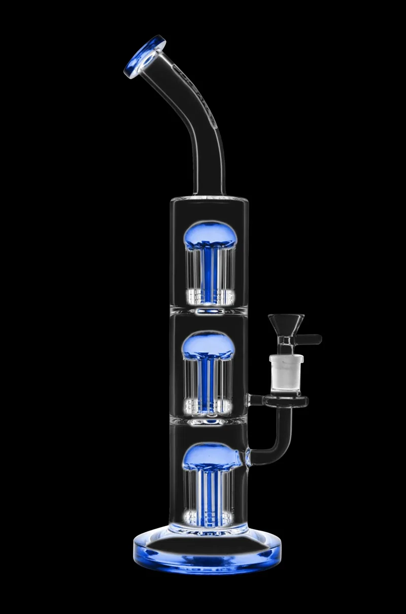 This 14 inch tall bong from Pulsar brings not one, or two, but THREE jellyfish percolators to the table to maximize water filtration. This is a smooth-hitting bong that allows you to enjoy all the flavor nuances of your favorite flower stains. The Triple Jellyfish Perc Water Pipe is made from durable boro glass. It has an angled neck for easy tabletop access. It’s equipped with a 14.5mm female joint and a fixed reinforced downstem. It comes ready for action with a handled 14.5mm male herb slide. This tall straight body water pipe is available in blue or green.