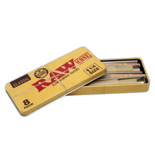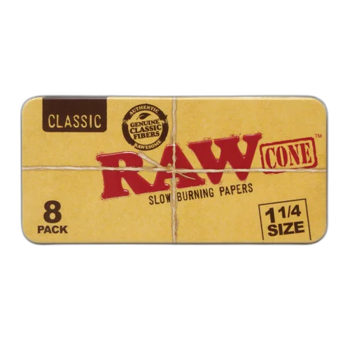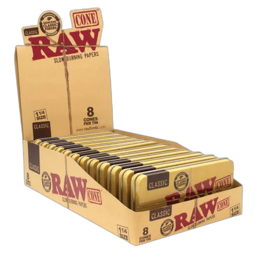 The RAW® - Classic Cones Tin 1 1/4 (8ct) - Display of 12 offers premium pre-rolled convenience. Comes in a quantity of display of 12. 8-count package for maximum value. Suggested retail price $6.00. A consistent seller in any smoke shop's pre-roll section. Available at wholesale pricing from Port City Wholesale.