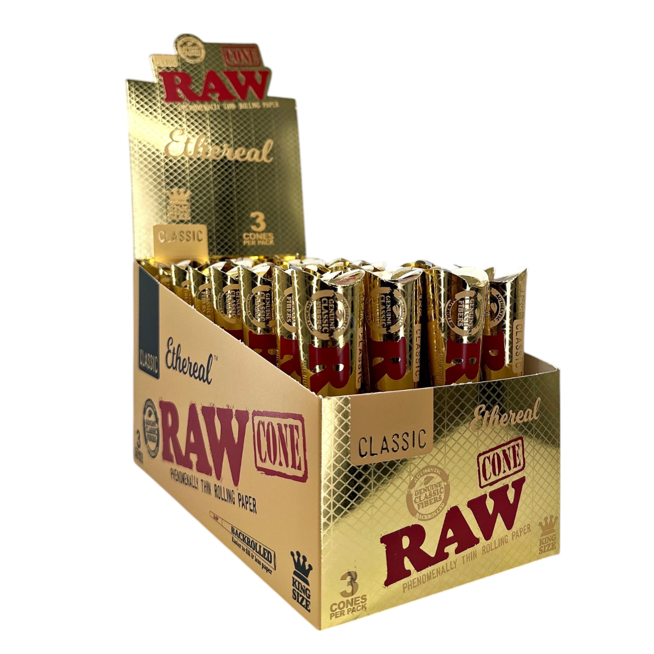 RAW CLASSIC ETHEREAL KING SIZE CONE 3CT PER PACK DISPLAY OF 32 (RAW-198) RAW Classic Ethereal King Size Cones deliver the signature RAW unrefined paper experience in a convenient pre-rolled format. Each pack includes 3 king size cones crafted for a smooth, slow, and even burn using RAW’s naturally derived fibers and classic construction standards. Packaged in a retail-ready display of 32 packs, the RAW-198 SKU is ideal for smoke shops and convenience retailers seeking a high-turnover rolling ess