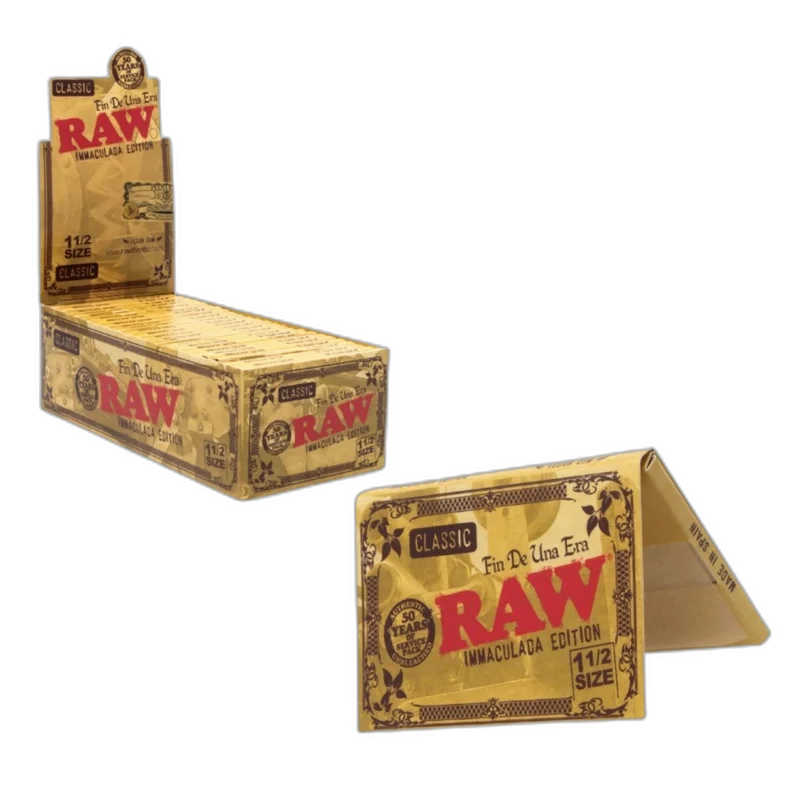 RAW CLASSIC IMMACULADA EDITION 1 1/2 33CT ROLLING PAPERS DISPLAY OF 25 (RAW-195) The RAW Classic Immaculada Edition 1½ Rolling Papers represent a premium, limited-edition release crafted for fans who appreciate RAW’s dedication to purity, tradition, and unrefined quality. Each pack includes 33 natural, unbleached rolling papers made from RAW’s signature plant-based fibers, offering a clean and authentic smoking experience. The 1½ size provides a slightly wider paper, ideal for users who prefer l