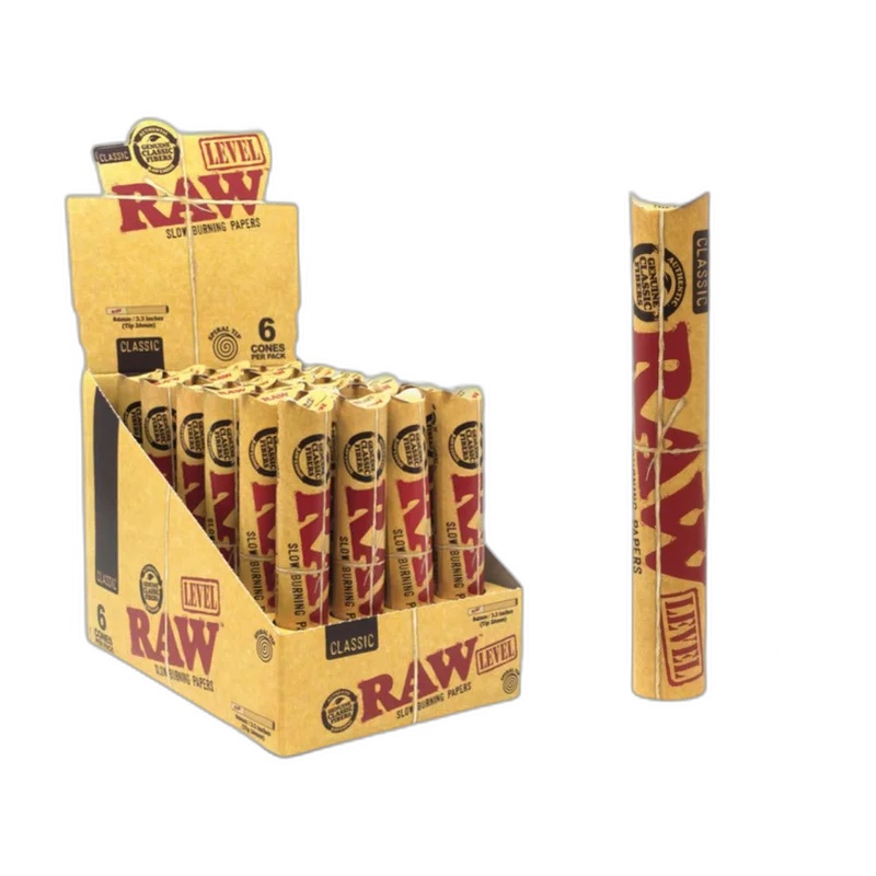 RAW CLASSIC LEVEL 3.3 INCHES 6CT CONES DISPLAY OF 24 (RAW-183) RAW Classic Level Cones measure 3.3 inches and come in a convenient 6-count pack , offering ultra-thin, slow-burning paper ideal for a smooth, flavorful smoke. Designed for consistency and ease, these pre-rolled cones are a must-have for customers who value RAW's commitment to quality and natural materials. Perfect for wholesale smoke shop suppliers , headshops , and retailers stocking authentic RAW products in ready-to-use formats.